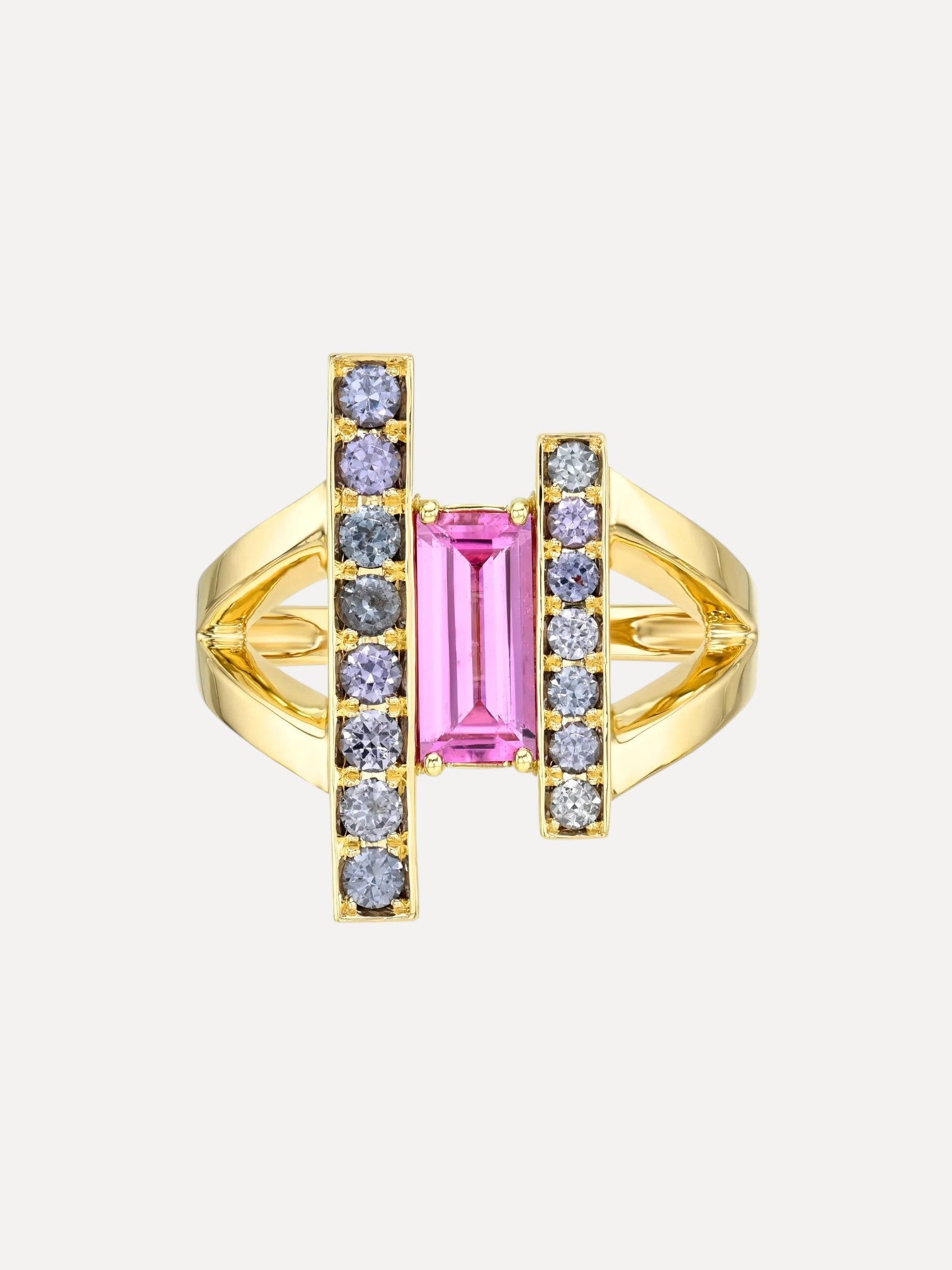 Crafted in 18k gold, the Cosmic Bloom Bar Ring features 1.02 cts of Madagascar sapphire and 1.09 cts of color-change garnet, balancing strength and brilliance in a piece that feels architectural yet expressive.