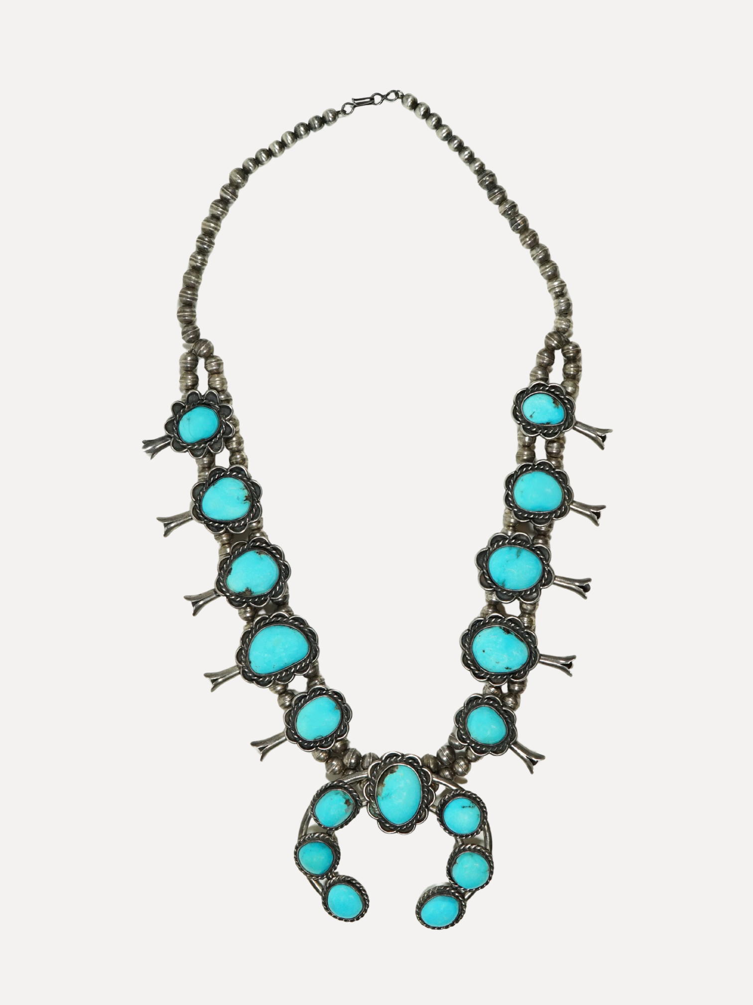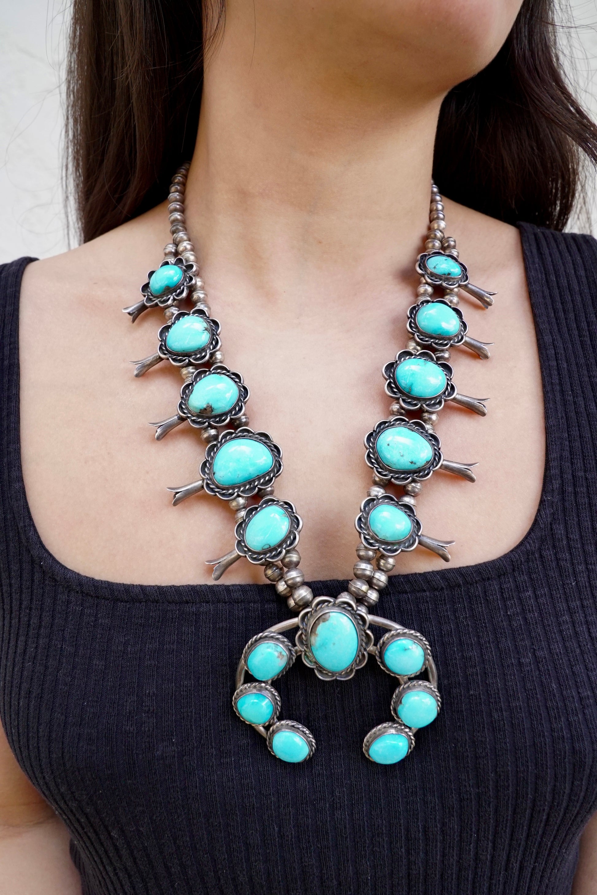 Description A striking Navajo squash blossom necklace by Etta Tom, featuring handcrafted sterling silver beads and traditional naja pendant. Bold, timeless, and emblematic of Southwestern Native American jewelry artistry.