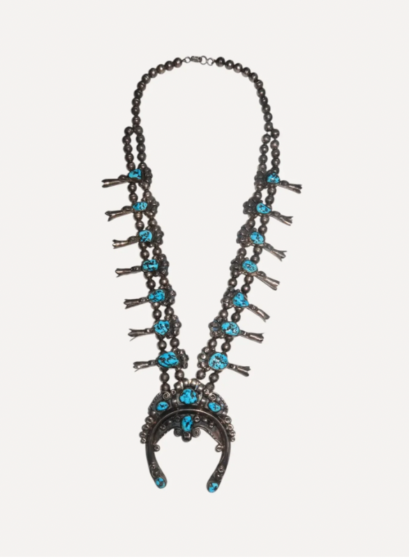 A classic c.1970 squash blossom necklace by renowned Navajo silversmith Jimmie Long. Featuring traditional silverwork and a bold Naja, this piece reflects the enduring beauty of vintage Navajo jewelry.