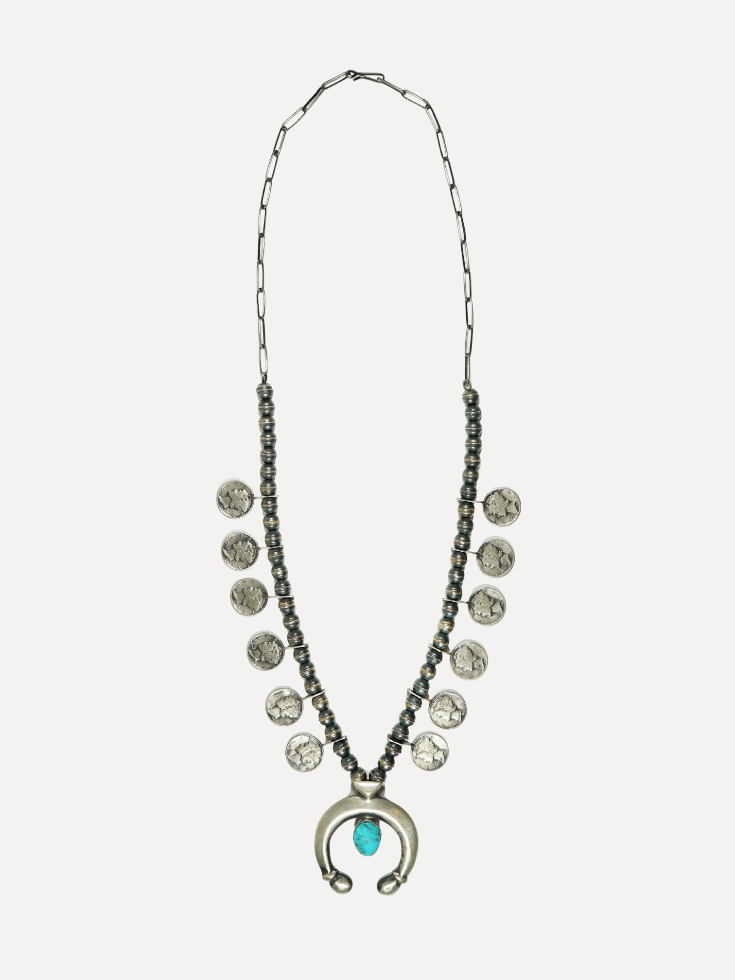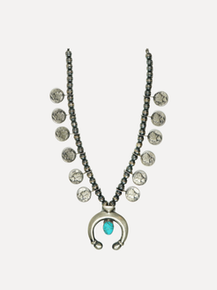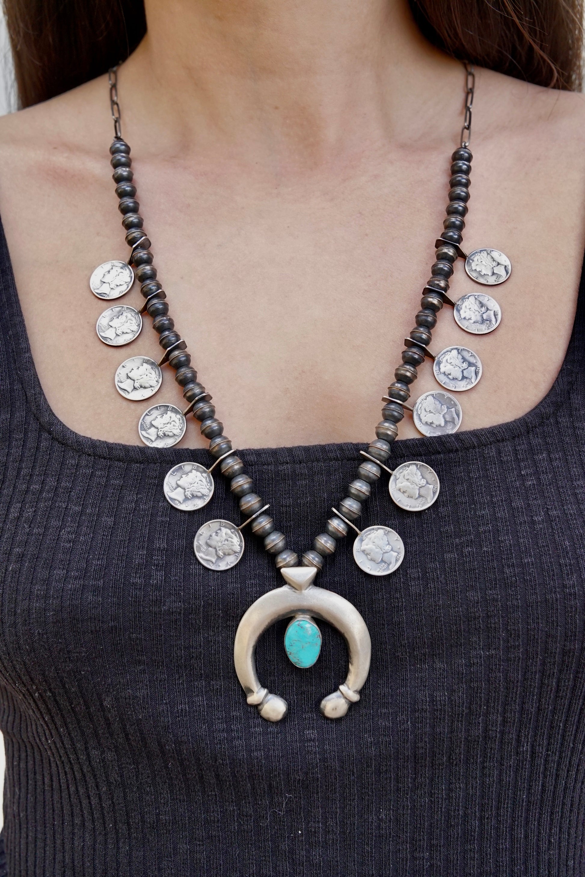 At Squash Blossom, we have always believed that jewelry should tell a story, one that blends history, artistry, and individuality. Our Vintage Mercury Dime Squash Blossom Necklace is a prime example to this philosophy. Carefully made from sterling silver and accented with natural turquoise, this unique piece weaves together elements of the American West, Native American craftsmanship, and a hint of nostalgia through authentic Mercury dimes minted between 1936 and 1945.