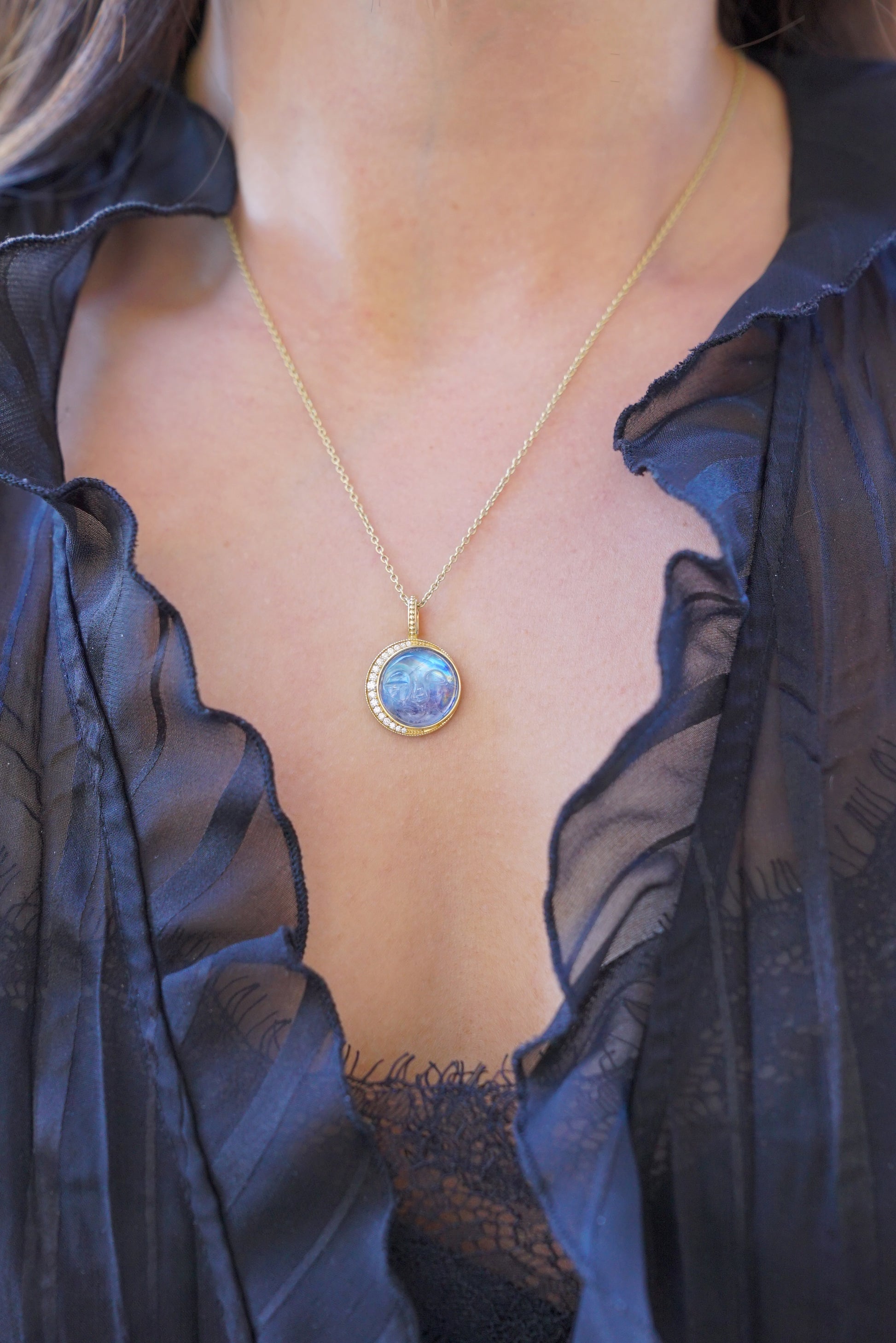 Add a touch of celestial charm with this yellow gold "Man on the Moon" pendant, featuring a luminous moonstone. Handmade in New York by Penny Preville, this playful piece captures the magic of the night sky, perfect for dreamers who love a little sparkle with their style.