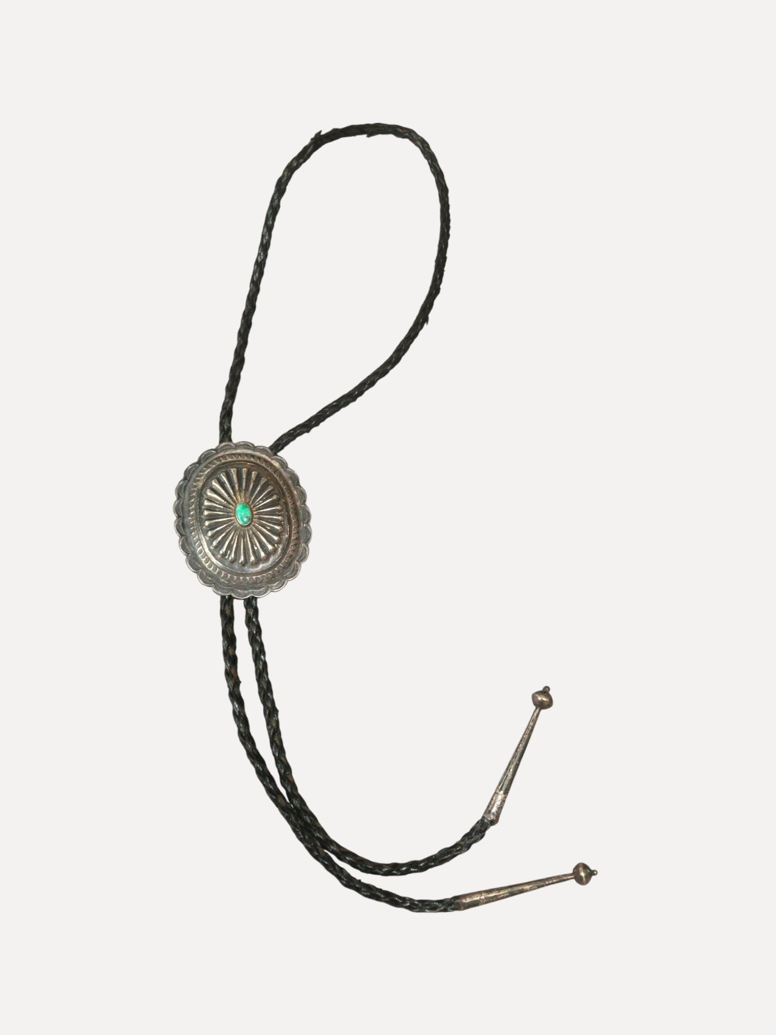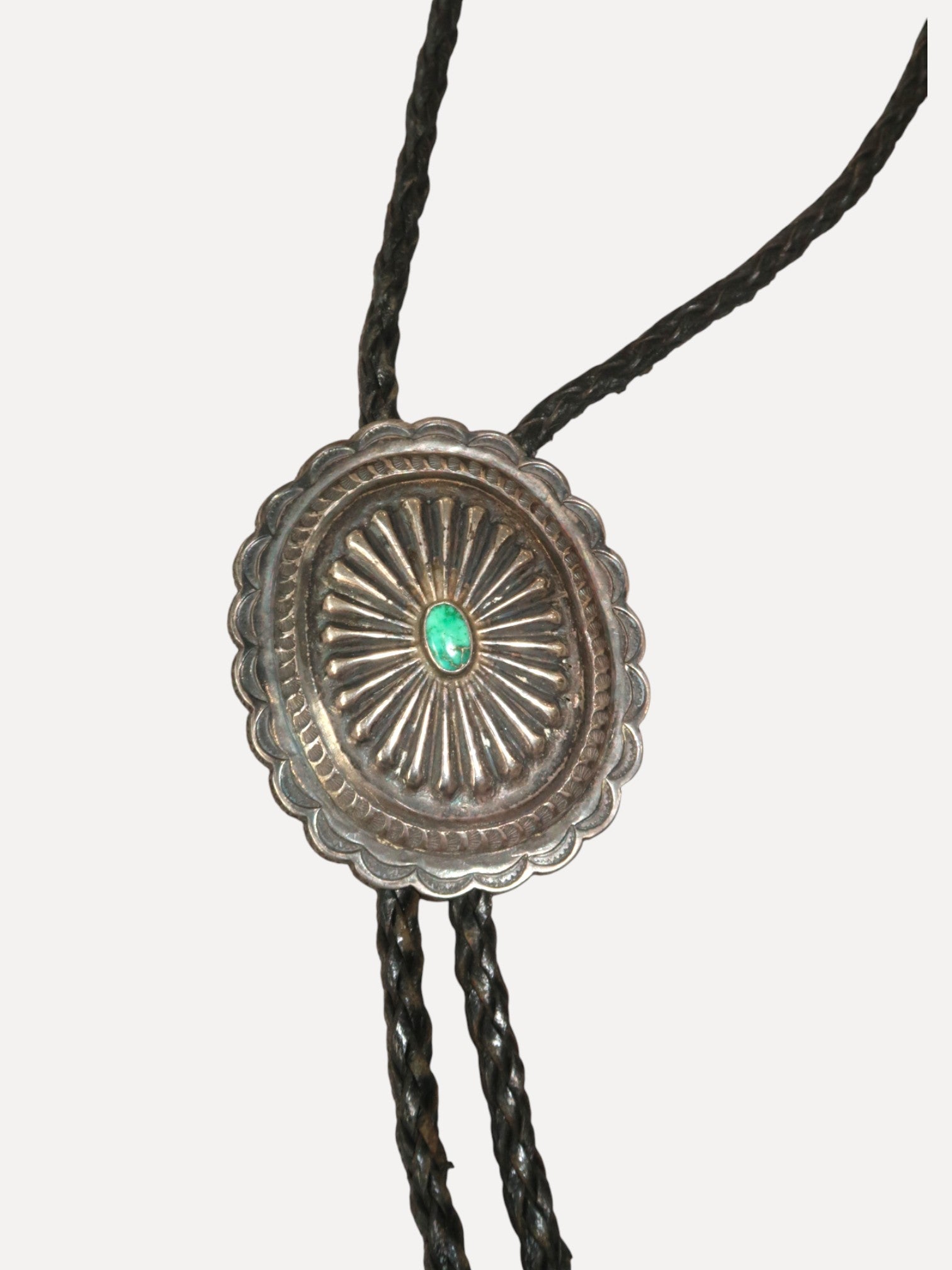 This stunning vintage bolo tie features an authentic concho centerpiece dating back to the 1930s—a true piece of Southwestern history. The hand-crafted concho showcases intricate metalwork and patina that only decades can create, making each detail a conversation starter. Perfect for adding genuine character to any outfit, whether you're dressing up for a special occasion or bringing vintage flair to your everyday style. A collector's treasure and a timeless accessory that proves good taste never goes out of fashion.
