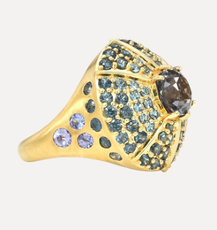 Glowing like a lunar halo, this one-of-a-kind ring draws the eye to its vibrant center. A brilliant spinel is encircled by sapphires and tanzanites that radiate outward in a soft, celestial gradient—reminiscent of the light that surrounds a full moon on a clear night.