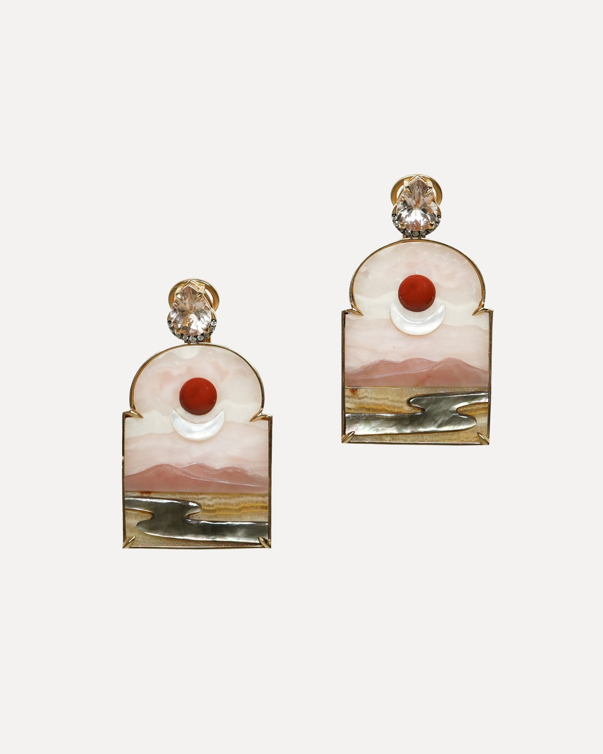 Romantic and artful, these 18K rose gold earrings feature a window-format design with a delicate pink sky print in black and white mother of pearl. Accented with pink opal, guava quartz, red jasper, and alabaster, they are a harmonious blend of color, texture, and craftsmanship.