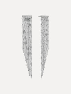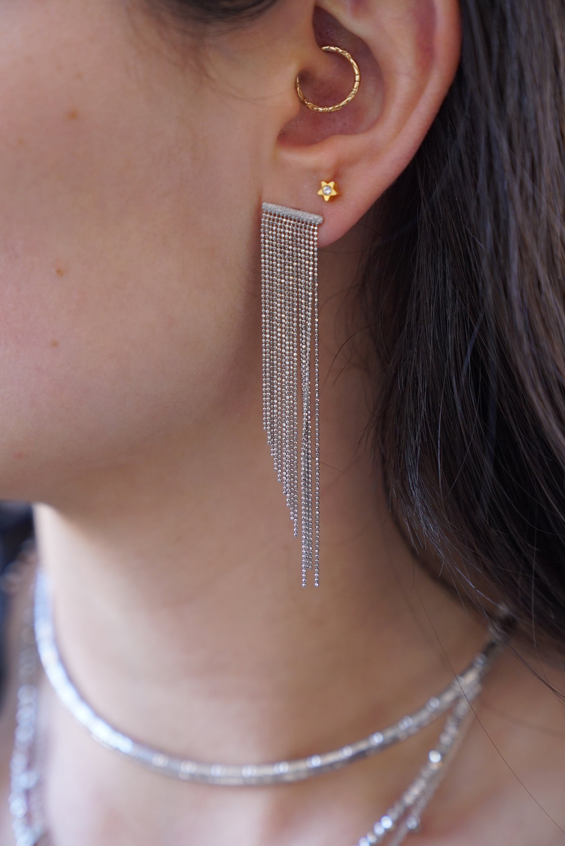 Delve into a world of modern sophistication with the Halley Earrings. Artfully crafted with delicate strands of lustrous platinum and unique design shimmers and sways with the wearer.